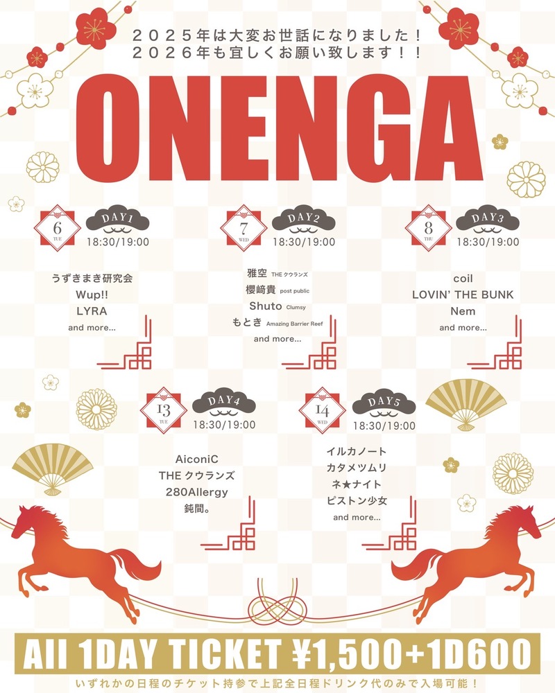 いずれかの日程のチケット持参で全公演ドリンク代のみで入場可能!